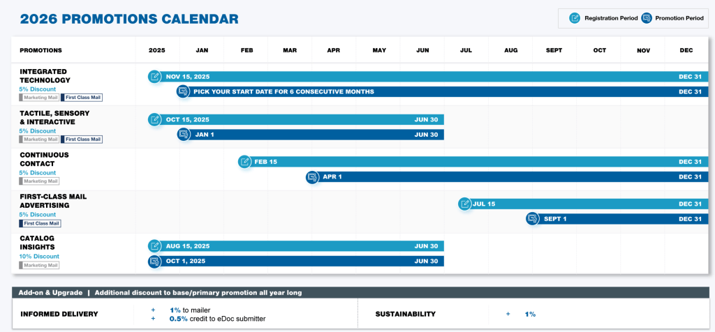 Registration for the Catalog Insights promotion opened on August 15, 2025, offering a 10% discount. Catalog-producing Mail Owners should review the 2025–2026 Catalog Insights details to ensure they don’t miss out on the value this promotion delivers.